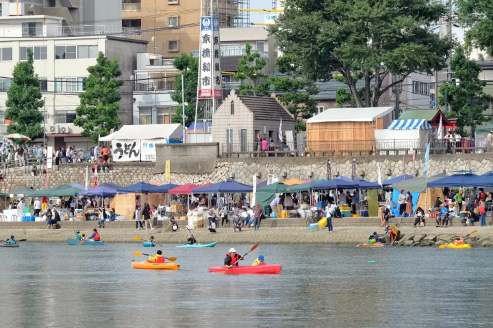 朝市が開かれる京橋西詰め旭川河川敷では、カヌー体験も楽しむことができます。初心者でも簡単にチャレンジでき、家族連れや若い方にも大変人気があります。子どもは身長110cm以上から体験可能です。