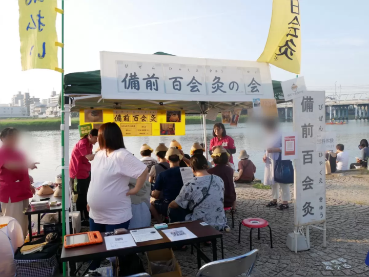 帽子のように陶器を頭に乗せた大人たちの光景に、最初は少し驚いて足を止めてしまいました。お話を伺うと、岡山の伝統工芸品である備前焼で作られた専用のお皿を頭に乗せて、「百会」という頭頂部のツボにお灸をする「備前百会灸」の無料体験が行われていました。