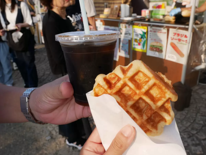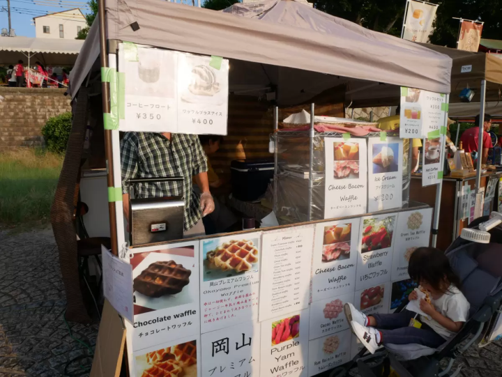 プレーンワッフルはわずか180円、アイスコーヒーは200円と非常にリーズナブルな価格設定です。通常は岡山の有名な庭園「岡山後楽園」のバス停近くにあるお土産物店で営業しているそうです。2歳の娘も最後まで美味しそうに完食していました。