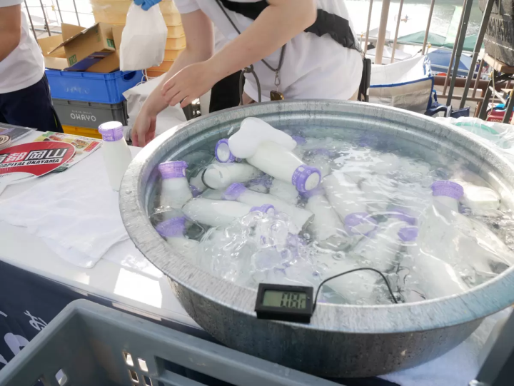 朝に飲む美味しくて冷たい牛乳はいかがでしょうか?岡山に本社を構える「オハヨー乳業」が朝市に出店し、日本人にとって懐かしい学校給食セットを販売していました。ガラスの瓶に入った牛乳と揚げパン2つ(砂糖味ときな粉味)がセットで500円という価格です。