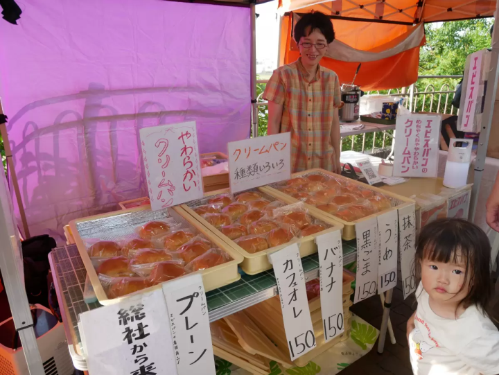「エビスパン」は総社市にあるパン屋さんで、京橋朝市ではクリームパンのみを販売しています。プレーン、抹茶、バナナ、カフェオレなど種類が豊富に揃っています。クリームパンはふわふわで、優しい甘さが特徴的。つい何個も食べてしまいたくなる美味しさです。マーガリンやイーストフード(化学添加物)を使用していない、体に優しい製法にもこだわっています。