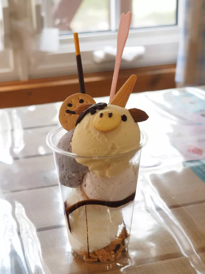 今回は牛をあしらってもらいました。中のジェラートは、やきいも、ブルーベリー、いちご、搾りたてミルクの4種をチョイス。一度に4つの味が楽しめるのが贅沢です。その日によって並んでいるジェラートの味が違うそうなので、何度訪れても新しい発見があります。食べるのがもったいなくなるほどの可愛さでした。