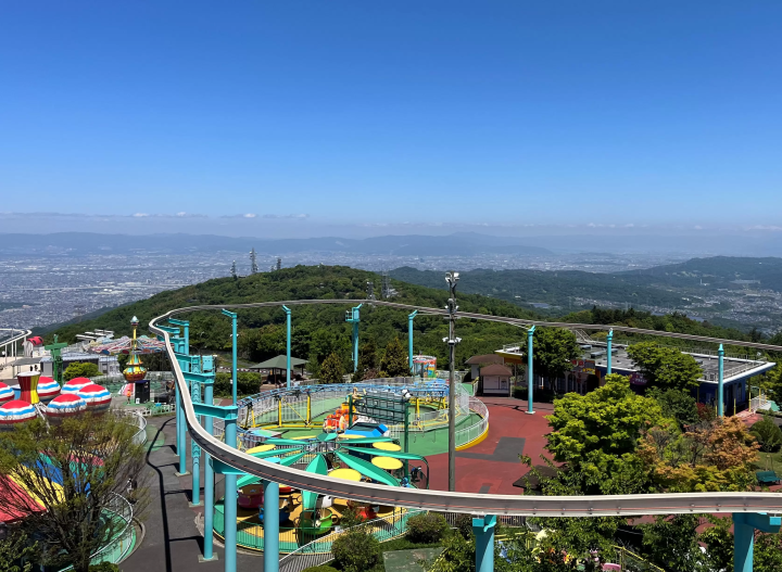 遊園地の魅力は標高642メートルから360度のパノラマビューを楽しむことができることです。眼下に広がる生駒市内をはじめ、奈良盆地や東大寺も眺めることができます。あべのハルカスや大阪城も望むことができますよ。有名観光地を見つけられるか、ぜひ探してみてください。夏季は園内からロマンティックな夜景を眺めることもできます。