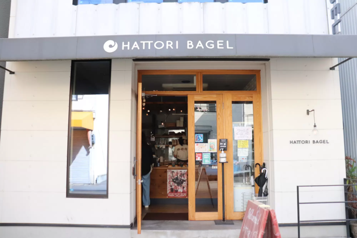 JR岡山駅西口のタクシー乗り場から徒歩約6分。いつもお客様で賑わっているベーグル専門店「HATTORIBAGEL」です。ベーグル(もちもちした食感の輪状のパン)がたくさん並んでおり、どれも美味しそうです。いつも迷ってしまうラインナップです。2階でイートインができるので、ゆっくりカフェタイムを楽しみたい方にもおすすめです。