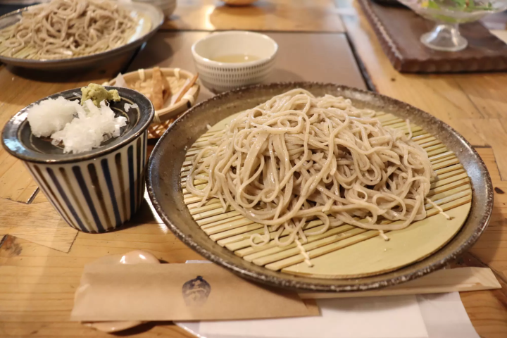 席に着くと、お茶とそばかりんとうが提供され、続いて茹でたてのそばが運ばれてきます。茹で加減も程よく、のど越しの良いそばを、薬味の入ったつゆにつけて頂きます。そばだけでもかなりの量がありますが、美味しいので完食できてしまいます!そば湯(そばを茹でた時のお湯で、日本の伝統的な飲み物)も運ばれてきて、最後につゆを薄めて飲みます。ホッとするひと時です。でも、これで終わりではありません。ここから惣菜のランチが始まります。そばは前菜のような位置付けです。