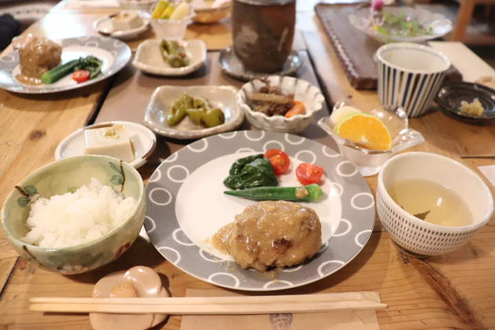 JR岡山駅西口のタクシー乗り場から徒歩約8分。ほぼ北に向かってまっすぐ歩くとお店に到着します。大きな交差点の近くにありながら、静かで落ち着いた古民家風の建物が特徴で、開店と同時にいつも多くのお客様で賑わっています。オーナーが一人で切り盛りしており、そばかりんとう(そば粉で作った日本の伝統的なお菓子)、そば、惣菜(おかず)、フルーツ、デザートと、豊富なコース料理を提供しています。惣菜と一緒にご飯も付いてくるので、お腹いっぱいになります。