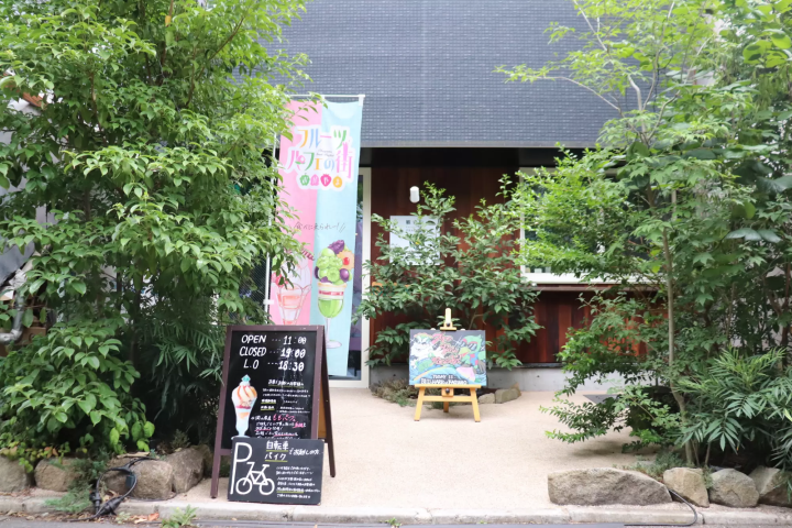JR岡山駅西口のタクシー乗り場から徒歩約6分。細い路地に行列ができているのを見ると、「観音山フルーツパーラーOKAYAMA」があります。フルーツ王国・岡山を堪能できるパフェが楽しめる専門店です。外の受付で整理番号券を受け取り、入店できる時間まで周辺を散策するのがおすすめです。店内にはカウンター席とテーブル席があります。
