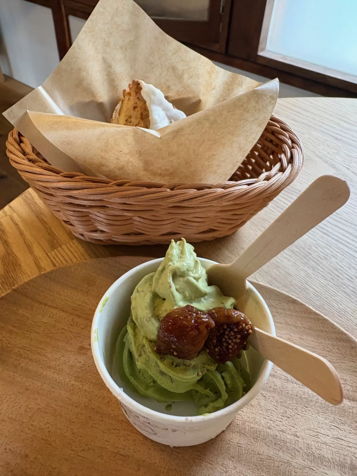 まぜるアイスの容器はカップとコーン(ワッフルコーン)から選ぶことができるので、カップにしました。ベースのアイスは抹茶(日本の緑茶を粉末にしたもの)にして、イチジクのドライフルーツを混ぜてもらい、スコーンも一緒に頂きました。弾力のあるアイスクリームにドライフルーツがクラッシュ(細かく砕かれた状態)で入っているので、アクセントになってとても美味しかったです。自分の好きなものを詰め込んだアイスクリームでした!アイスとスコーンの相性も良く、お腹いっぱいになりました。