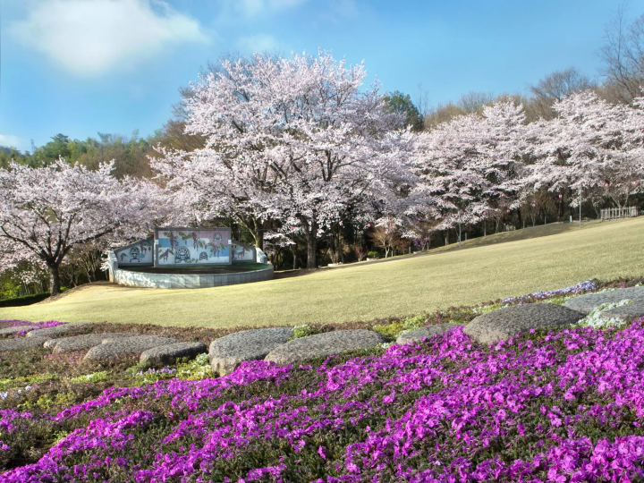 桜山公園は全国さくら名所100選に選ばれた場所です。園内には二度咲きの桜「冬桜」が約7000本あり、春にはソメイヨシノと合わせて約1万本の桜が咲き誇ります。また、桜山公園には桜のほかにツバキ、ツツジ、サルスベリ、ロウバイなどが植えられており、四季を通じてさまざまな花や植物を楽しむことができます。